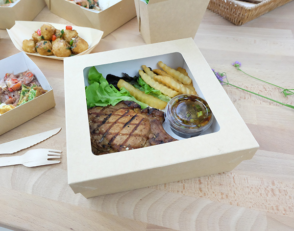 กล่องอาหารพร้อมฝาไซส์ 14x14x5 ซม. เป็นกล่องกระดาษคราฟฟูดส์เกรด ปลอดภัยเมื่อสัมผัสอาหาร เคลือบป้องกันน้ำมันด้านใน สามารถย่อยสลายได้ง่าย