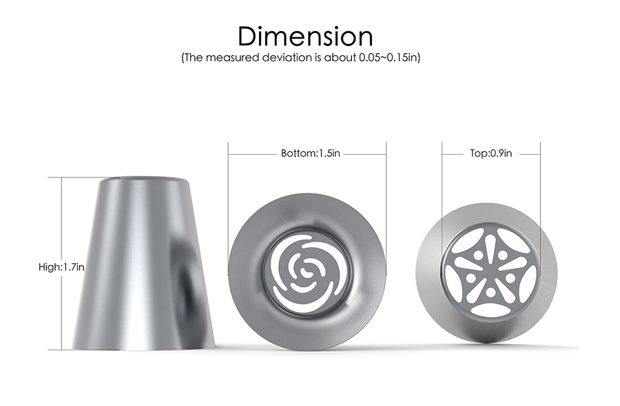 Upper diameter: 0.9inch; under diameter: 1.45inch; height: 1.69inch